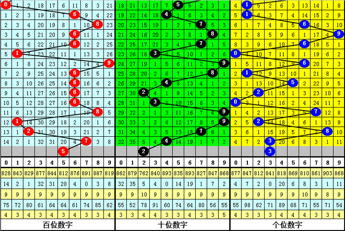 百位上期出现:冷号7,该位连续十期以热号出现较多,以冷号出现较少,目前该位遗漏15期以上的冷号有3个:3、4、5,本期注意该位冷号逐渐解冻,关注冷号5。