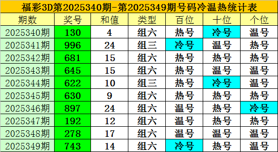 上期回顾:福彩3D第2025349期开奖奖号为:743,奖号类型为:组六,奖号冷温热态为:冷号+热号+温号。